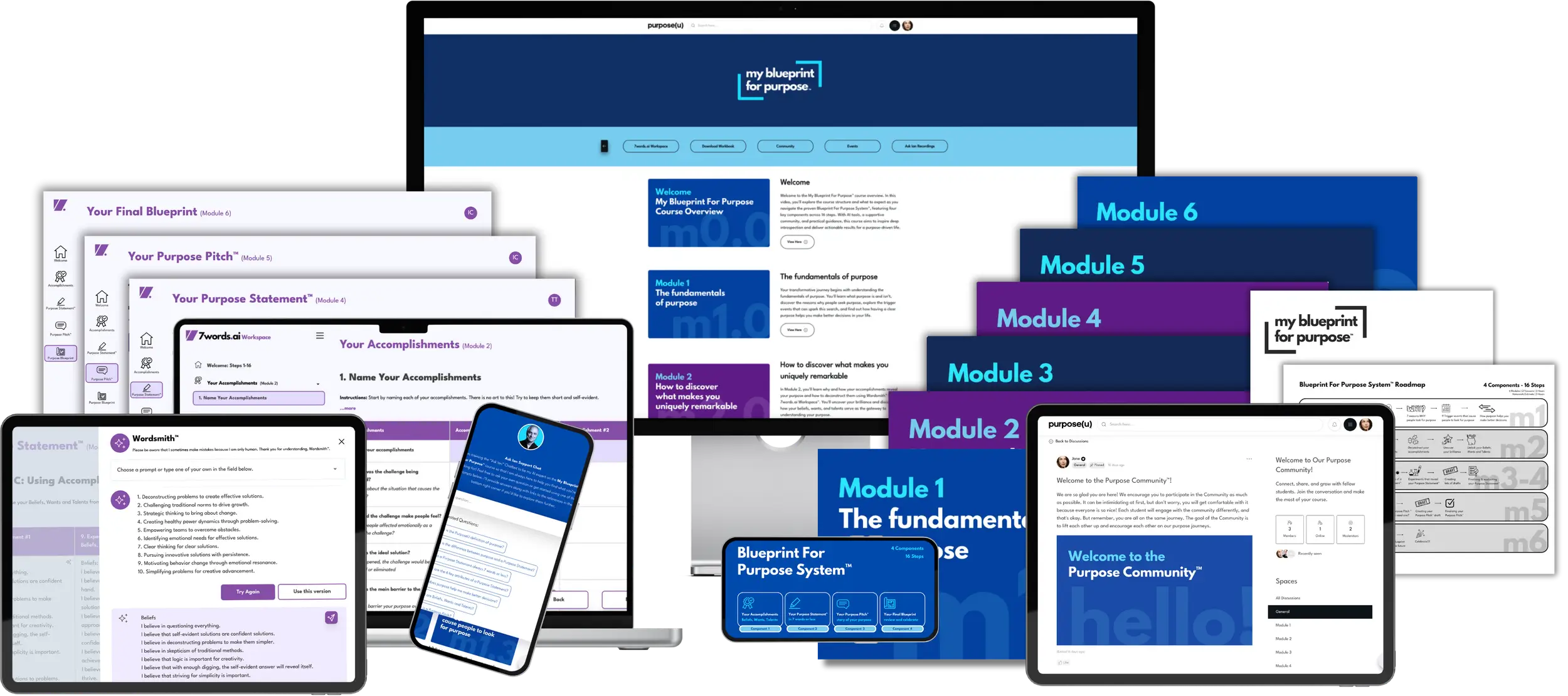 With the Blueprint For Purpose System™, we guide you step-by-step—using AI—to help you quickly find, share, and start living your purpose. There are four main parts: