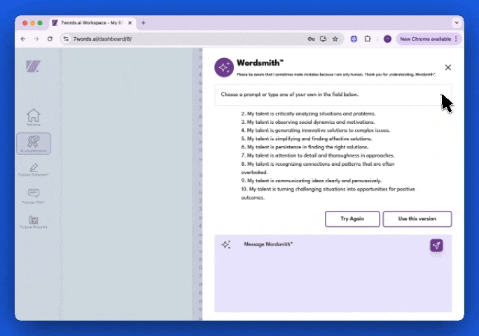 uncover for the values, beliefs and talents that play a role in my accomplishments. Wordsmith’s Try Again option was very helpful at producing different ways of describing these important pieces of the puzzle.