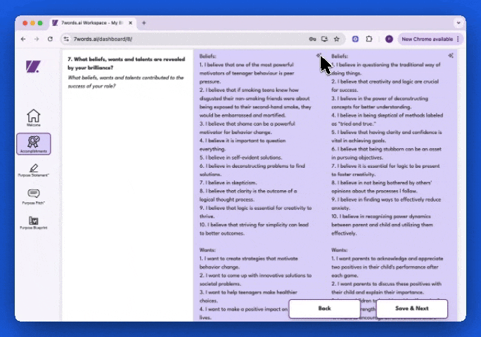 Our AI tools will help you quickly discover your purpose and express it clearly in 7 words or less, making it easier than ever to stay focused.